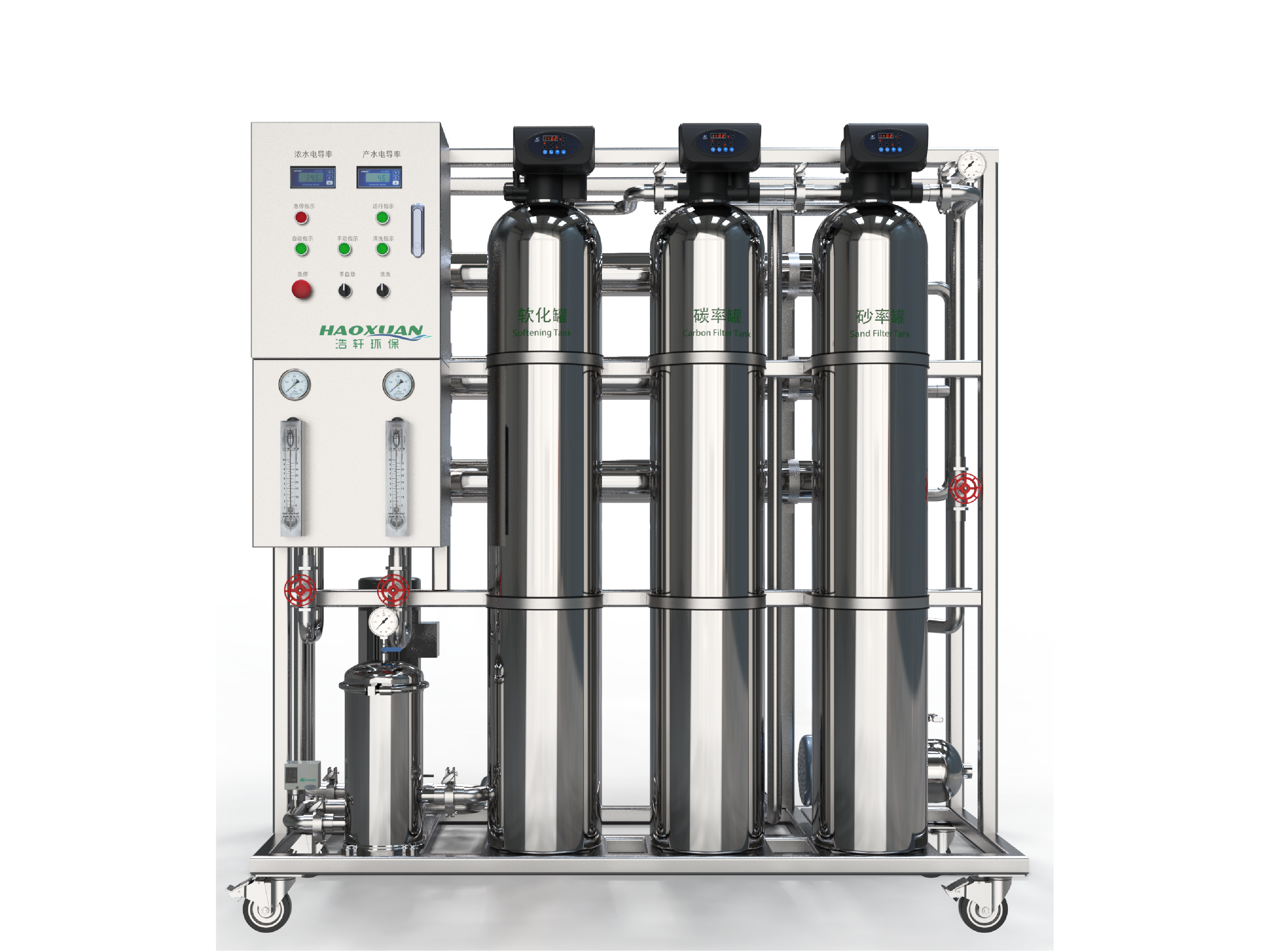 | 过滤工艺:原水--砂率--碳滤--软化过滤--保安过滤器--RO反渗透膜 | |