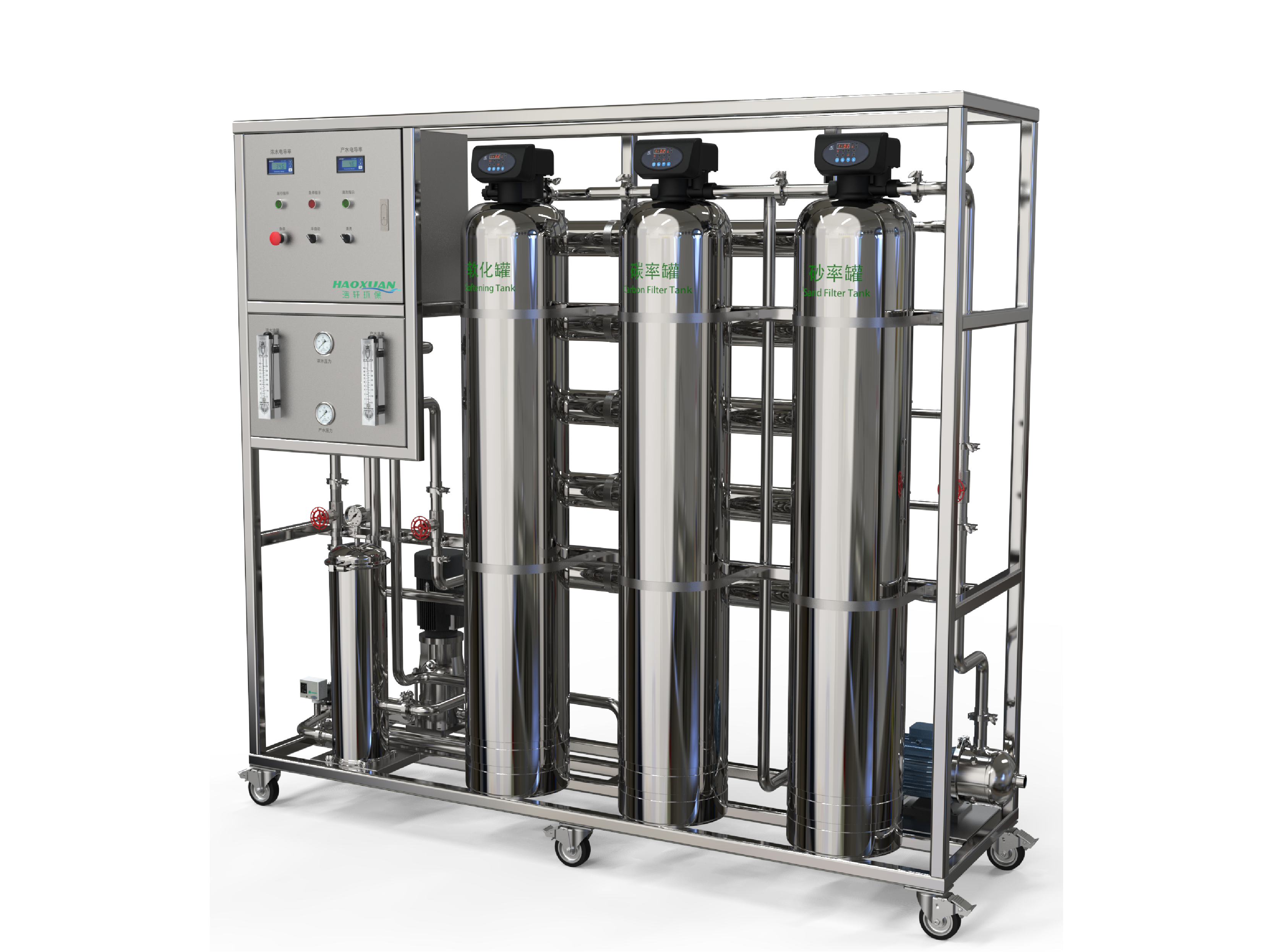 | 过滤工艺:原水--砂率--碳滤--软化过滤--保安过滤器--RO反渗透膜 | |